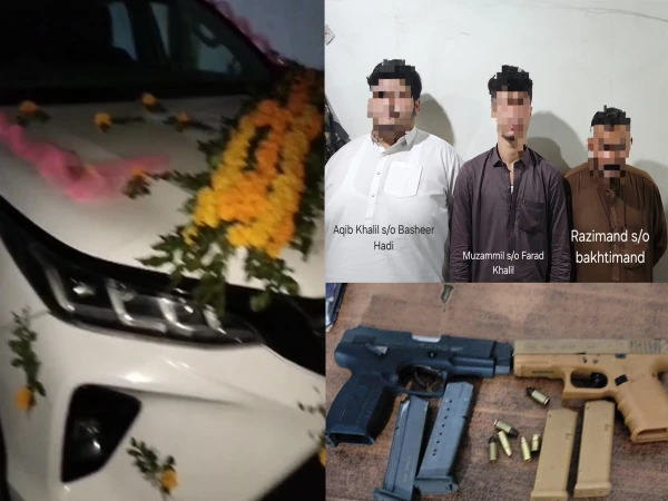 پولیس نے ملزمان کے قبضے سے دو عدد پستول بمعہ ایمونیشن برآمد کیے جبکہ بارات میں استعمال ہونے والی تین گاڑیاں بھی تحویل میں لے لی۔