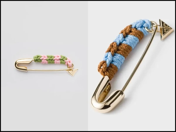 ’قروشیے سیفٹی پِن بروچ‘ نامی پیتل سے بنا یہ سیفٹی پِن رنگین قروشیے میں لپٹا ہے جس پر پراڈا کا ایک چھوٹا سا تکون لوگو لگا ہے۔