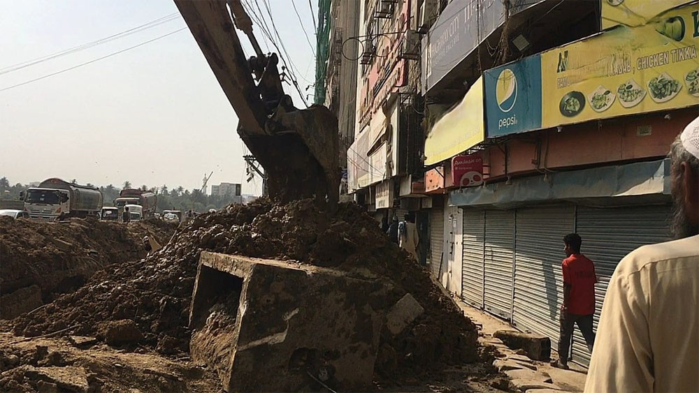 اسی ٹریک پر قائم دکان کے ایک مالک نے روتے ہوئے کہا کہ اس وقت ہمارے کاروبار کی یہ صورتحال ہے کہ ملازمین کی تنخواہیں دینے تک کی رقم نہیں ہے ہم کس سے شکایت کریں؟ ہم اس وقت بہت مشکل حالات سے گزر رہے ہیں اور ترقیاتی کام ہمیں اپنی زندگی میں پورے ہوتے نظر نہیں آرہے، ناقص منصوبہ بندی نے شہر کی انتہائی اہم شاہراہ یونی روسٹی روڈ کو تہس نہس کر رکھ دیا، ہم ریڈ لائن انتظامیہ کو شکایت کرتے ہیں تو وہ واٹر کارپوریشن پر ڈال دیتے ہے، واٹر کارپوریشن سے رابطہ کیا جاتا ہے تو ریڈ لائن یا کے فور منصوبے کی انتطامیہ کو مورد الزام ٹھہرادیا جاتا ہے۔