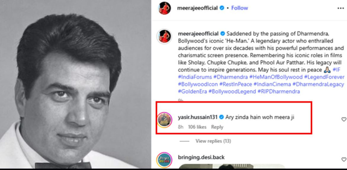 پوسٹ کے بعد صارفین نے فوری طور پر کمنٹس میں بتایا کہ دھرمیندرا زندہ ہیں۔ یہاں تک کہ اداکار یاسر حسین نے بھی لکھا: "ارے میرا جی، وہ زندہ ہیں!" تاہم، کئی گھنٹے گزرنے کے باوجود میرا نے اپنی پوسٹ ڈیلیٹ نہیں کی۔
