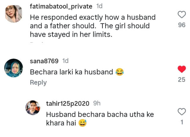 ایک اور نے کہا ’آفریدی نے ایک باوقار شوہر اور باپ کی طرح جواب دیا۔ لڑکی کو اپنے الفاظ میں احتیاط رکھنی چاہیے تھی‘۔