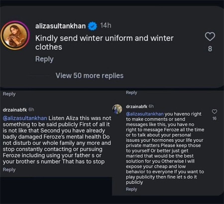 پاکستان کے مشہور اداکار فیروز خان کی موجودہ اہلیہ ڈاکٹر زینب اور سابقہ اہلیہ علیزہ سلطان کے درمیان انسٹاگرام پر جھڑپ ہو گئی۔