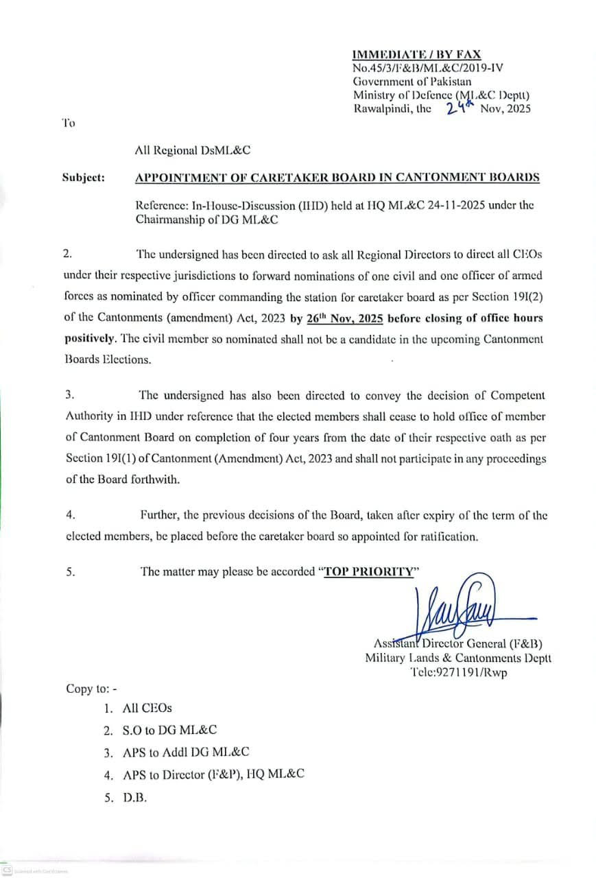 منتخب ممبران کی آخری بورڈ میٹنگ کے بعد کے فیصلے کئیر ٹیکر بورڈ کے سامنے پیش کرنے کی ہدایت کی گئی ہے۔ کئیر ٹیکر بورڈ کا نامزد سویلین ممبر کنٹونمنٹ الیکشن میں حصہ نہیں لے سکے گا۔
