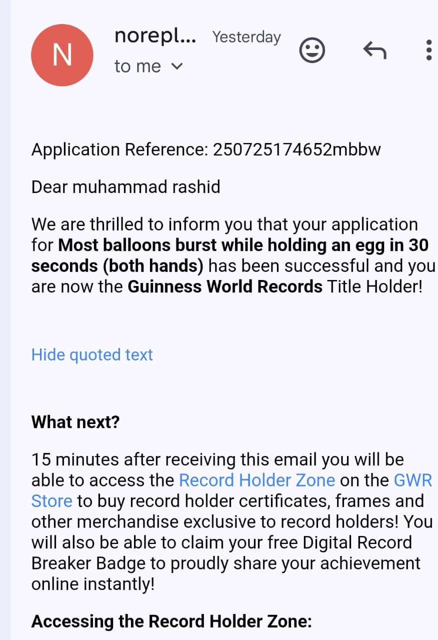 گنیز ورلڈ ریکارڈ کے عالمی دن کے موقع پر فاطمہ نسیم نے دونوں ہاتھوں میں انڈا پکڑ کر غباروں کو پھاڑنے کا عالمی ریکارڈ بنایا تھا۔