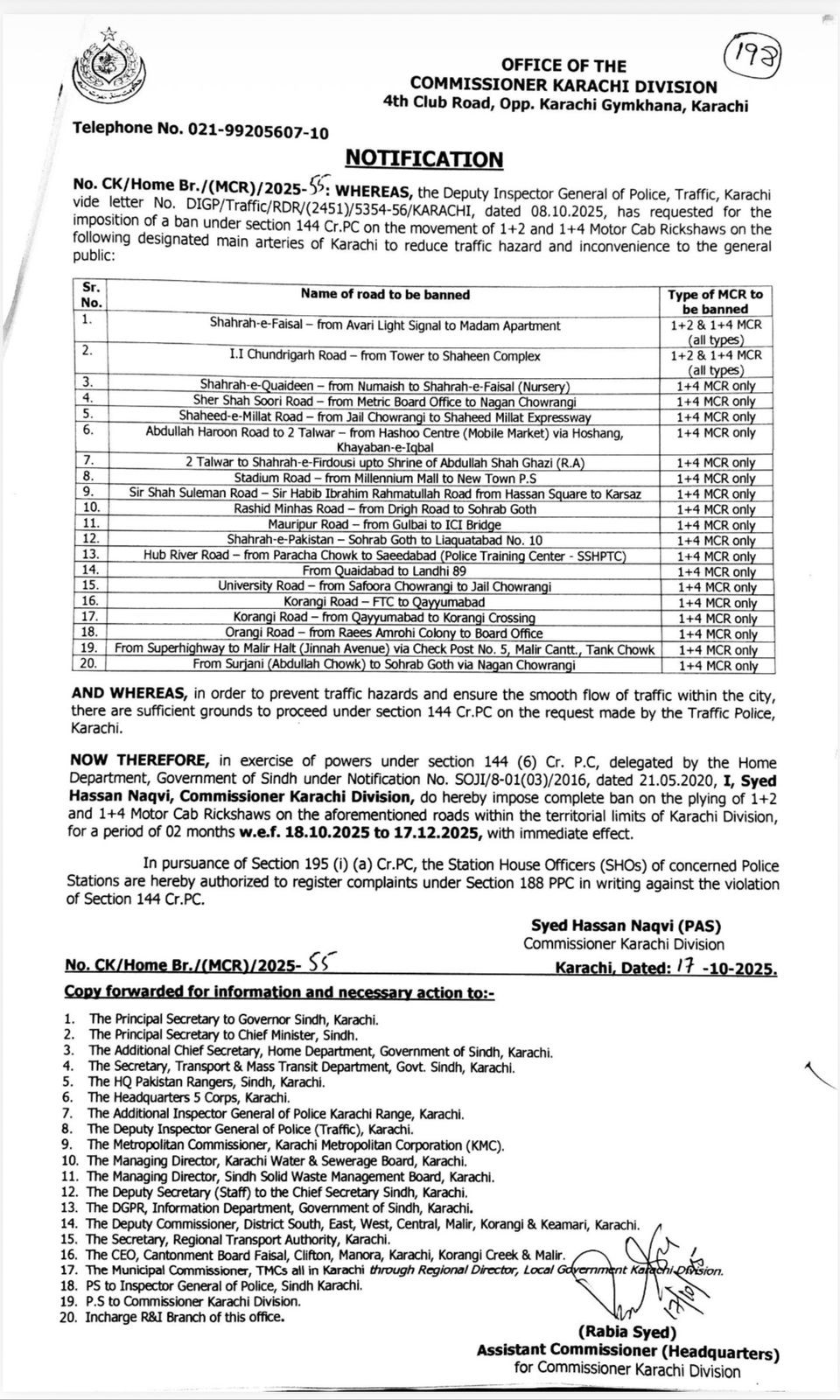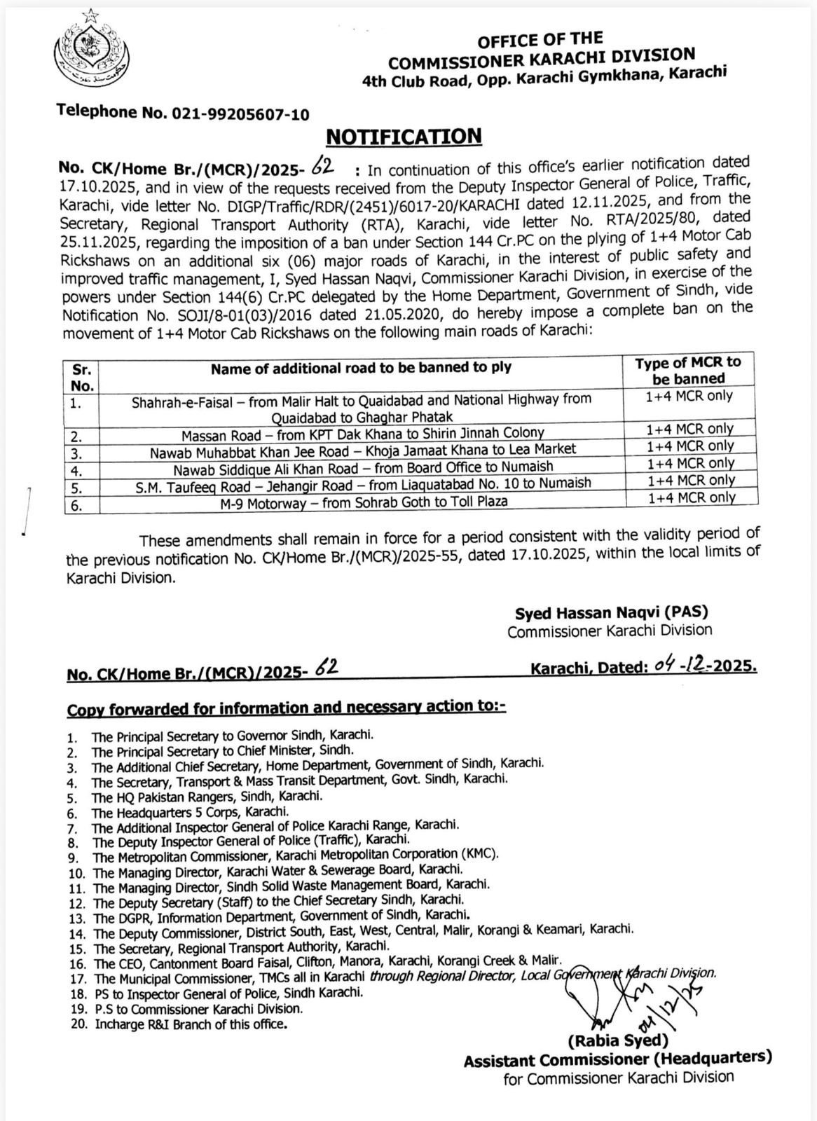 نوٹی فکیشن کے مطابق ڈی آئی جی ٹریفک کی سفارش پر شہر میں رکشا کی آمد ورفت محدود کرنے کا باقاعدہ فیصلہ کیا گیا ہے تاکہ ٹریفک کی روانی بہتر ہوسکے، شارع فیصل سے آئی آئی چندریگر روڈ تک رکشوں کی مکمل ممانعت فوری طور پر نافذ العمل ہوگی، شہر کی 26 سڑکوں پر رکشہ پابندی 18 اکتوبر سے 17 دسمبر 2025 تک مؤثر قرار دی گئی۔