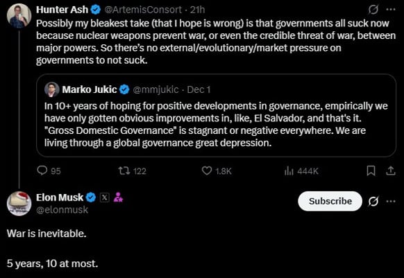 ایلون مسک نے اسی پوسٹ کے جواب میں پانچ سال یا زیادہ سے زیادہ دس سال میں جنگ ناگزیر ہونے سے متعلق پیشگوئی گی۔
