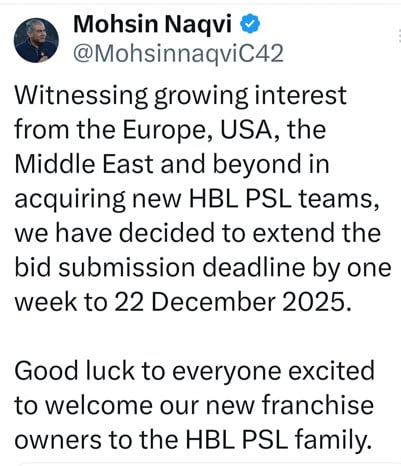 سماجی رابطے کے پلیٹ فارم ایکس پر چیئرمین پی سی بی محسن نقوی بتایا کہ پی ایس ایل کی بڑھتی ہوئی عالمی مقبولیت کے پیش نظر بڈنگ کی تاریخ میں توسیع کی گئی ہے۔