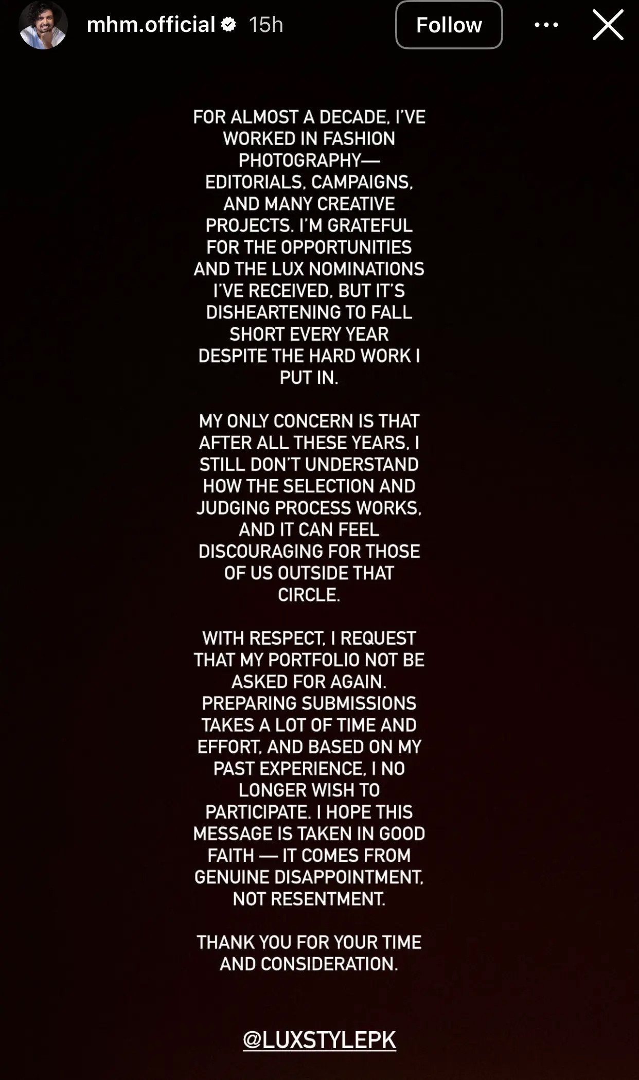 بہترین فیشن فوٹوگرافی کے ایوارڈ کے لیے نامزد محمد حسنین محمود نے انسٹاگرام پر اپنی مایوسی کا اظہار کرتے ہوئے کہا کہ وہ کئی سالوں سے سخت محنت کر رہے ہیں، لیکن ہر بار ایوارڈ سے محروم رہنا افسوسناک ہے۔