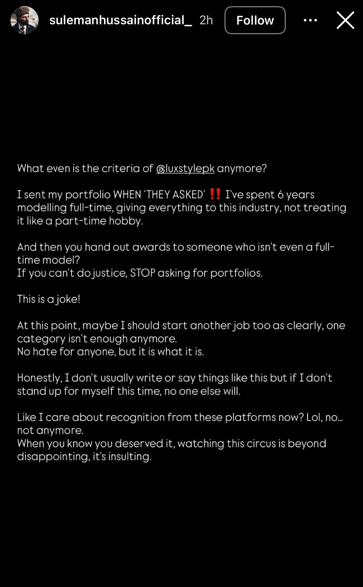 ماڈل سلیمان حسین نے بھی ایوارڈز پر تنقید کرتے ہوئے کہا کہ انہوں نے پورٹ فولیوز فراہم کیے، لیکن اس کے باوجود ایوارڈ ایک ایسے شخص کو دیا گیا جو پارٹ ٹائم ماڈل ہے۔