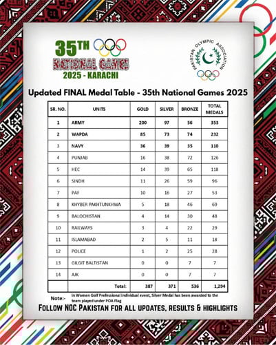 پاکستان آرمی نے8 روز تک جاری رہنے والے 35 ویں نیشنل گیمز میں مجموعی طور پر میڈلز کی ٹرپل سینچری اور گولڈ میڈل کی ڈبل سینچری مکمل کی۔پاکستان آرمی کے 358 میڈلز میں 200 گولڈ 97 سلور اور56 براز میڈل شامل رہے۔
