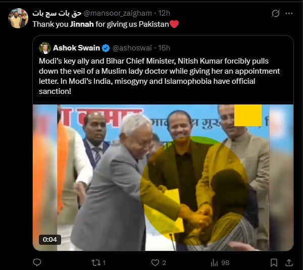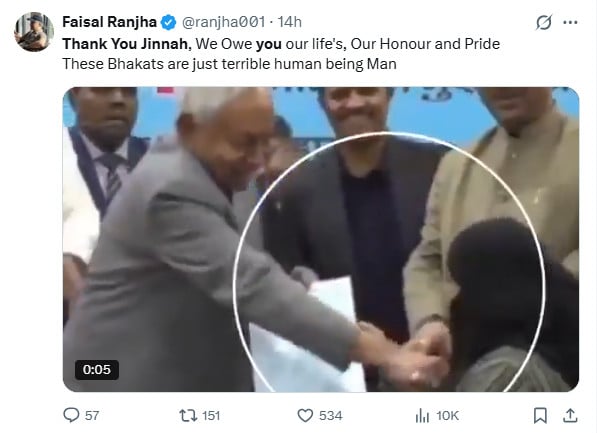 سوشل میڈیا پر وائرل ہونے والی ویڈیو میں دیکھا جاسکتا ہے وزیر اعلیٰ نتیش کمار اپوائنمنٹ لیٹر دیے جانے کی تقریب کے دوران ایک مسلم خاتون ڈاکٹر کو لیٹر دینے کے بعد ان کا نقاب کھینچ لیتے ہیں۔