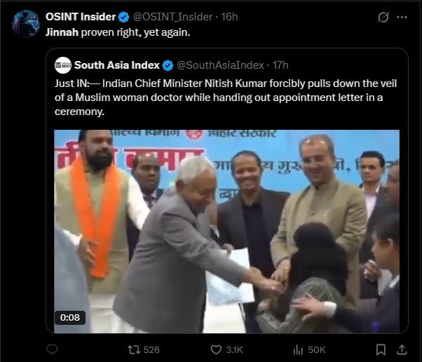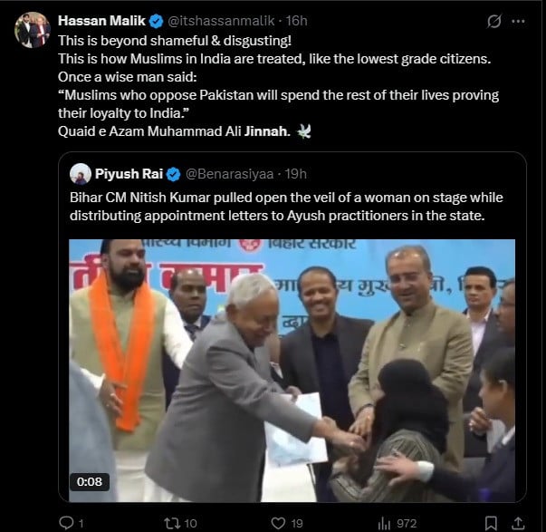 اس ہیش ٹیگ کے ٹرینڈ کرنے کی اصل وجہ گزشتہ روز بھارت میں پیش آنے والا ایک سنگین واقعہ ہے جس میں بھارتی ریاست بہار کے وزیر اعلیٰ کی جانب سے ایک مسلم ڈاکٹر کا نقاب کھینچا گیا۔