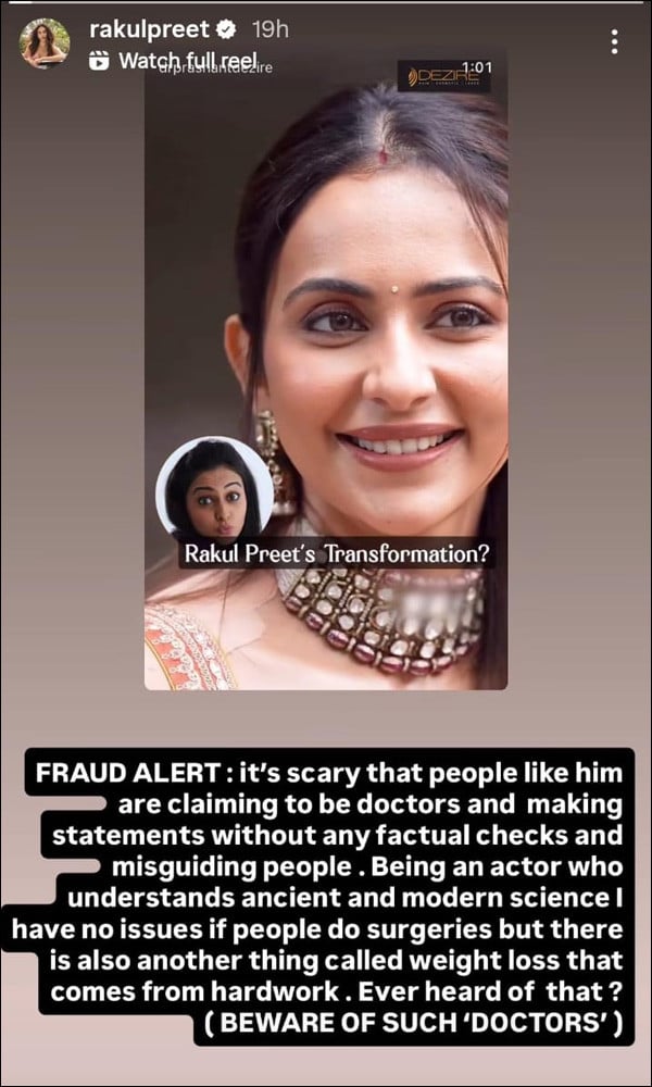 راکول پریت سنگھ نے اپنے مداحوں کو خبردار کیا کہ وہ سوشل میڈیا پر پیش کیے جانے والے ایسے طبی دعوؤں پر اندھا اعتماد نہ کریں، خاص طور پر جب انہیں پیشہ ورانہ حیثیت کا لبادہ اوڑھا کر پیش کیا جائے۔