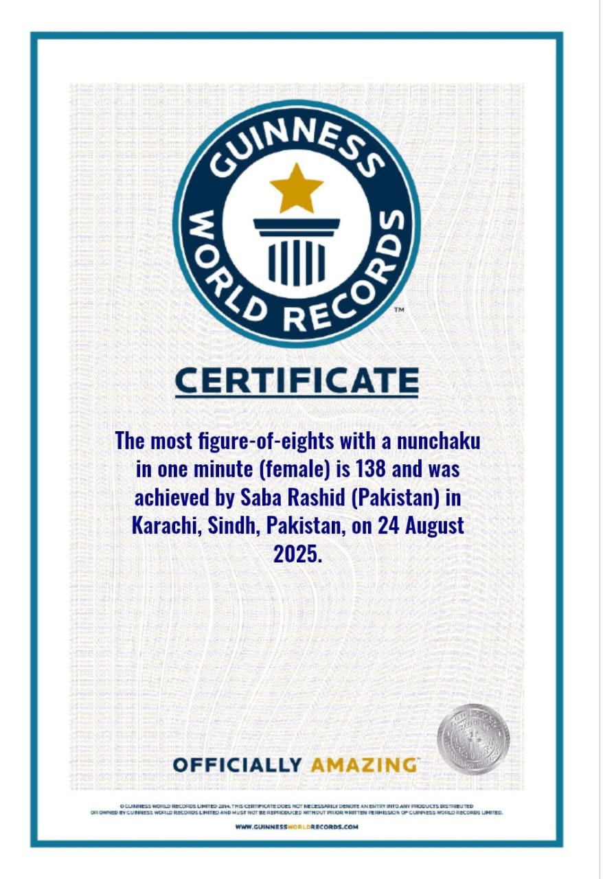 تفصیلات کے مطابق ایک منٹ میں نن چکو سے فیگر آف ایتھ بنانے کا عالمی ریکارڈ منظور کرلیا گیا۔ صبا راشد نے 120 کے مقابلے میں 138 مرتبہ نن چکو کو مہارت سے گھمایا۔