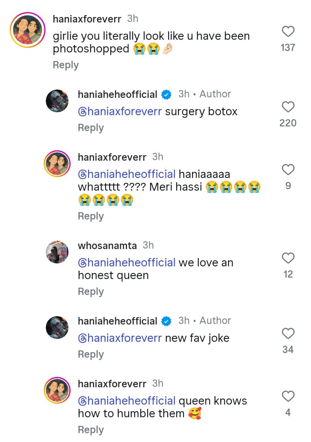 ہانیہ کی ویڈیو پر مداحوں نے خوب محبت لٹائی۔ ایک صارف نے تبصرہ کرتے ہوئے لکھا کہ وہ فوٹو شاپ کی ہوئی لگ رہی ہیں جس پر ہانیہ عامر نے دوٹوک انداز میں جواب دیا، ’’سرجری، بوٹوکس‘‘ اور ساتھ ہی اسے اپنا نیا پسندیدہ مذاق قرار دیا۔