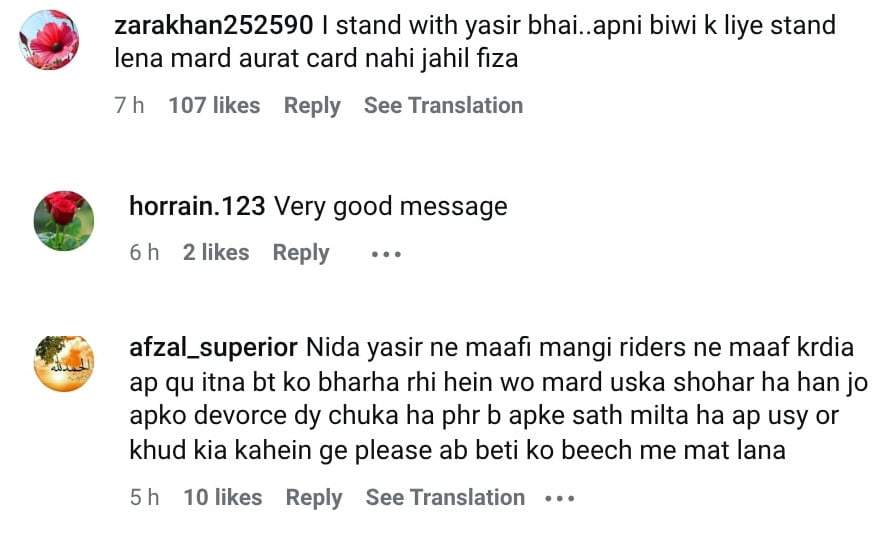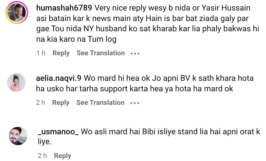 کچھ صارفین فضا علی کے مؤقف کی حمایت کر رہے ہیں جبکہ کچھ یاسر نواز کو بیوی کا ساتھ دینے پر سراہ رہے ہیں۔
