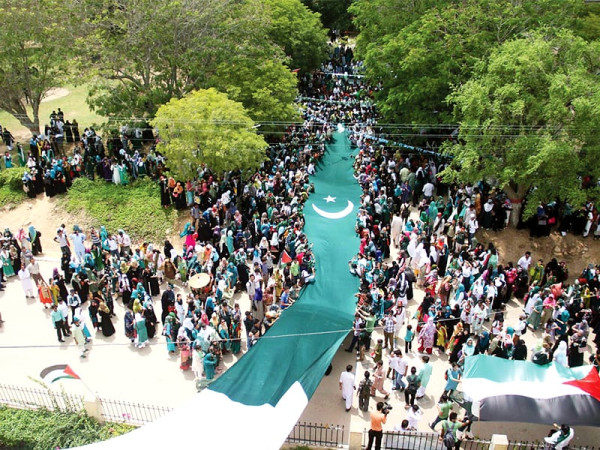 جشن آزادی کے حوالے سے جامعہ کراچی کی تقریب میں طلبہ و طالبات 250 فٹ طویل قومی پرچم تھامے ہوئے ریلی میں شریک ہیں۔ فوٹو: آن لائن