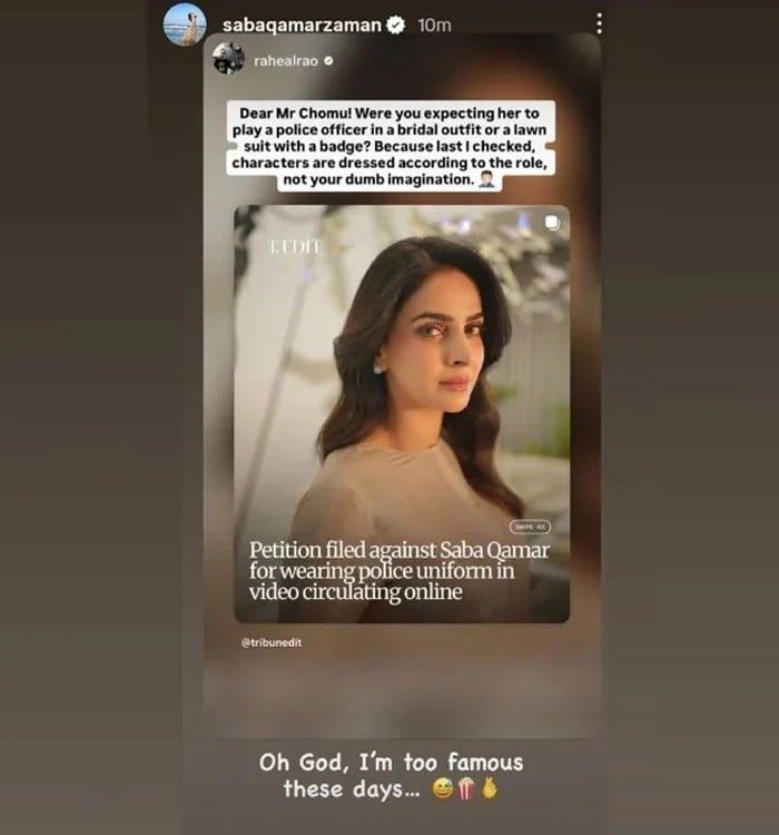 اس تنازع کے دوران صبا قمر نے دیوا میگزین کے ایڈیٹر اِن چیف راحیل راؤ کی ایک انسٹاگرام پوسٹ کو ری شیئر کیا، جس میں انہوں نے اداکارہ کا بھرپور دفاع کیا تھا۔ راحیل راؤ نے اپنے بیان میں طنزیہ انداز اختیار کرتے ہوئے لکھا کہ اگر کوئی اداکار پولیس افسر کا کردار ادا کر رہا ہو تو کیا اس سے یہ توقع کی جائے کہ وہ دلہن کے لباس یا لان کے سوٹ میں نظر آئے؟ ان کا کہنا تھا کہ کردار ہمیشہ کہانی اور اسکرپٹ کے مطابق لباس پہنتے ہیں، نہ کہ کسی کی من گھڑت سوچ کے تحت۔