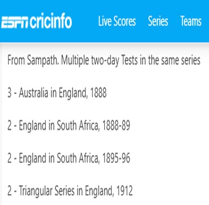 مجموعی طور پر چار مواقعوں پر ایسا ہوا ہے جب ٹیسٹ سیریز میں ایک سے زائد میچز دو دن میں ہی اختتام پذیر ہوئے ہوں۔