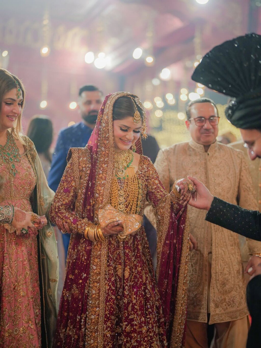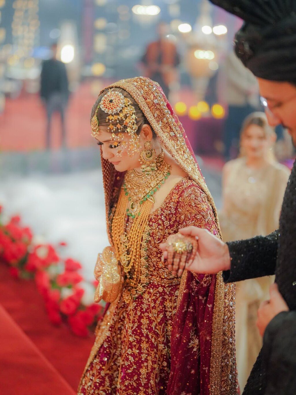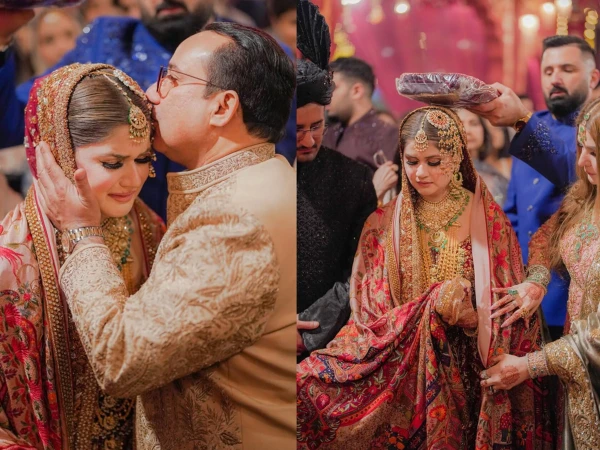 ماہین خان کی بارات لاہور میں ہوئی، وہ روایتی سرخ پاکستانی دلہن کے جوڑے میں پیاری لگ رہی تھی، جس میں ونٹیج طرز کے بھاری زیورات تھے۔