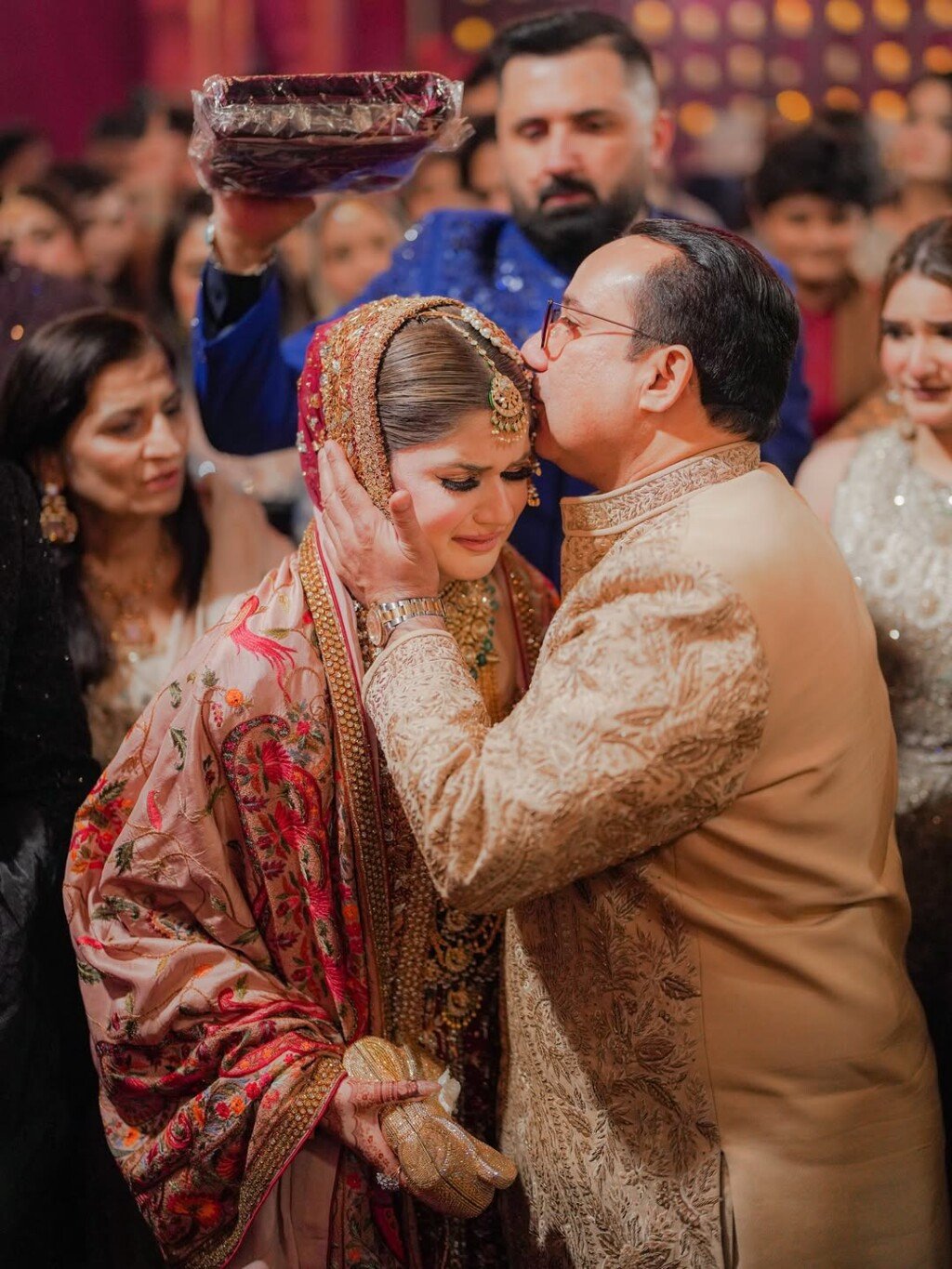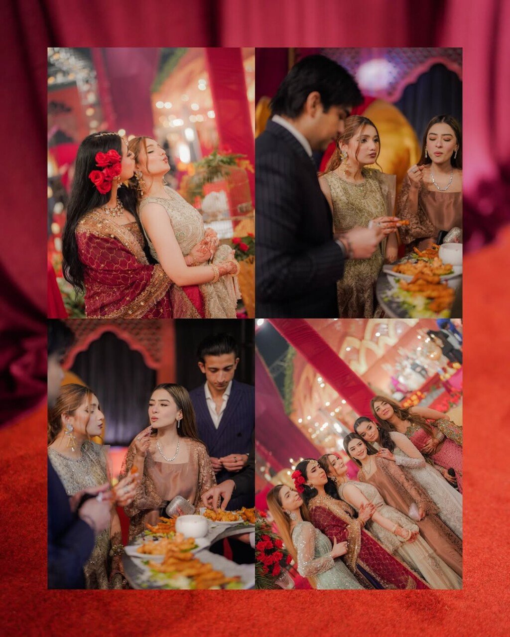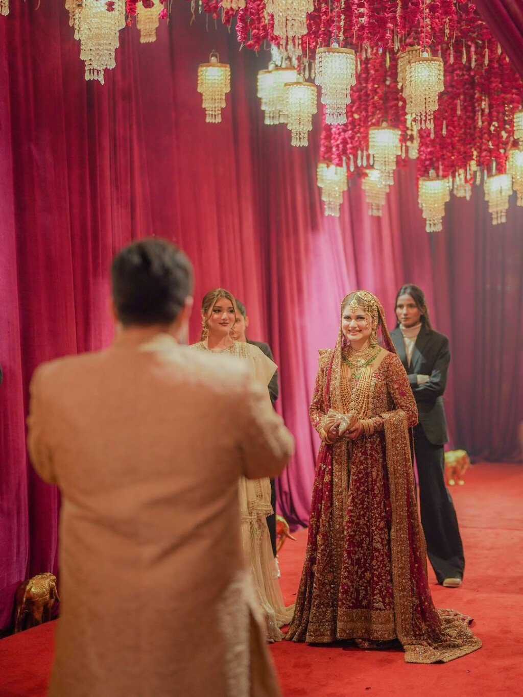 ماہین خان کی بارات لاہور میں ہوئی، وہ روایتی سرخ پاکستانی دلہن کے جوڑے میں پیاری لگ رہی تھی، جس میں ونٹیج طرز کے بھاری زیورات تھے۔