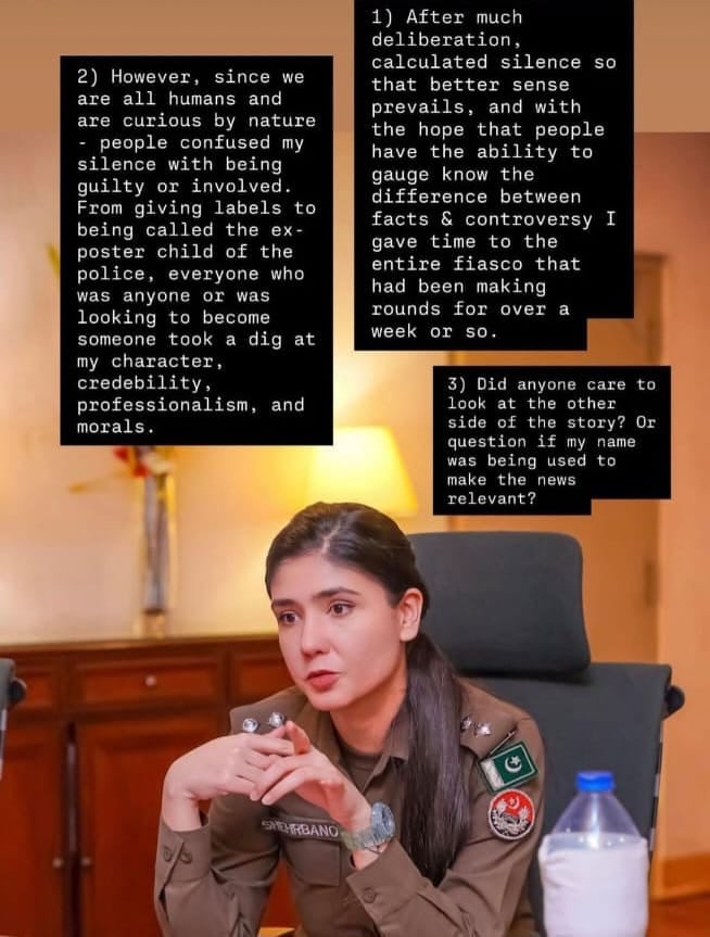 سماجی رابطے کی ویب سائٹ انسٹاگرام پر جاری اپنے ایک بیان میں اے ایس پی شہربانو نقوی نے کہا کہ میری دونوں پارٹیز سے صرف ایک ملاقات اپنے دفتر میں 9 مئی کو ہوئی، دونوں چیک پولیس کی مداخلت کے بغیر دیے گئے۔