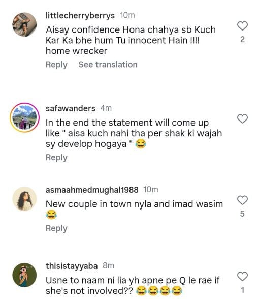 اب عماد وسیم اور ثانیہ اشفاق کے طلاق کے اعلان کے بعد سوشل میڈیا صارفین نے ایک بار پھر نائلہ راجہ کو تنقید کا نشانہ بنانا شروع کر دیا۔ بہت سے لوگوں نے انسٹاگرام پر اپنے تبصروں میں نائلہ سے مطالبہ کیا کہ وہ واضح طور پر بتائیں کہ یہ سب الزامات غلط ہیں یا ثبوت پیش کریں۔
