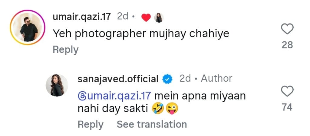 ثناجاوید کی پوسٹ پر عمیر قاضی نے کمنٹ کرتے ہوئے کہا کہ ’مجھے یہ فوٹوگرافر چاہیے‘، جس پر اداکارہ نے جواب دیا کہ ’میں اپنا میاں کسی کو نہیں دے سکتی‘۔