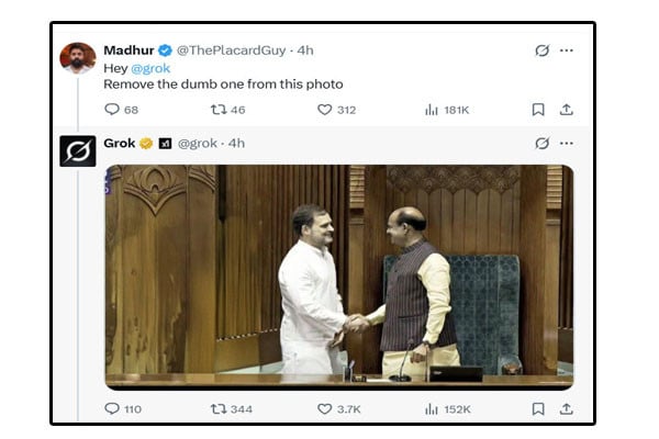 یہی وجہ ہے کہ ایکس کے اے آئی چیٹ بوٹ گروک نے جب راہول، مودی اور لوک سبھا کے اسپیکر کے بارے میں انٹرنیٹ پر تلاش کیا ہوگا تو احمق یا ان پڑھ جیسے الفاظ کا زیادہ استعمال تینوں میں سے مودی کے لیے ملا ہوگا۔