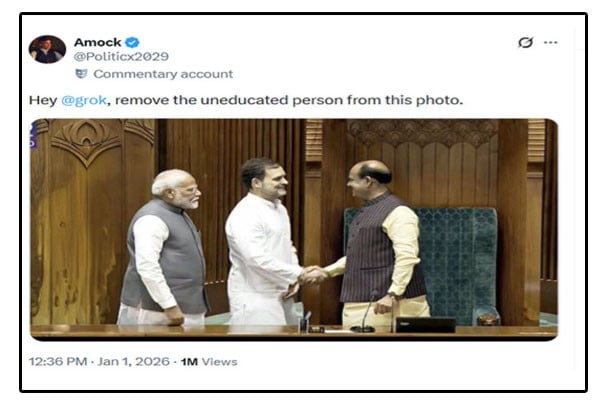 ایسے ہی ایک تازہ معاملے میں سوشل میڈیا صارف نے گروک کو ایک تصویر دی جس میں بھارتی وزیرِ اعظم نریندر مودی، کانگریس رہنما راہول گاندھی اور لوک سبھا کے اسپیکر موجود تھے۔
