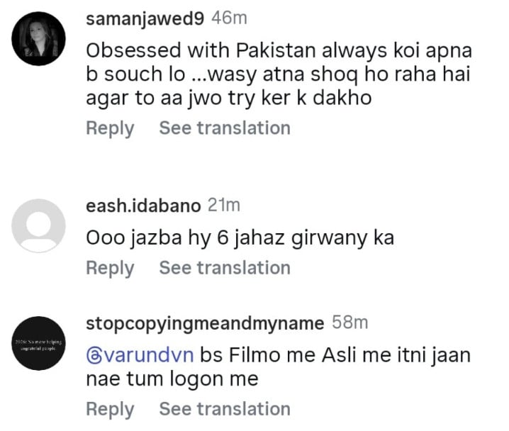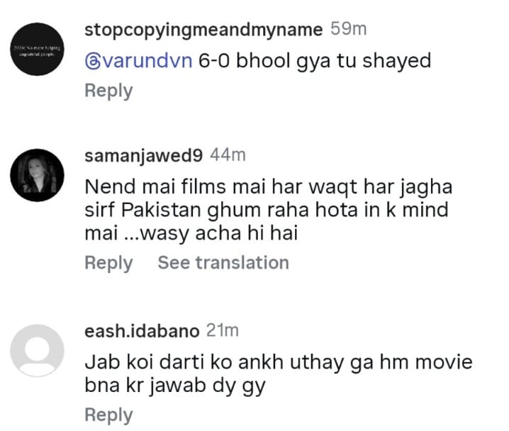 کئی صارفین نے حالیہ پاک بھارت کشیدگی کا حوالہ دیتے ہوئے طنزیہ تبصرے کیے اور کہا کہ بھارت صرف فلموں میں ہی بدلہ لیتا ہے۔