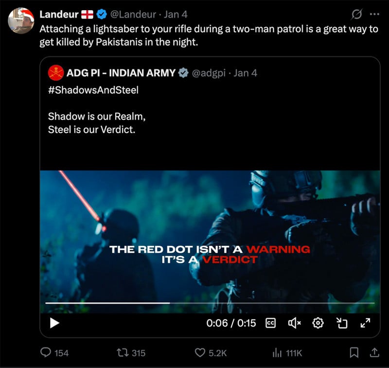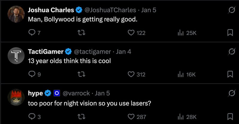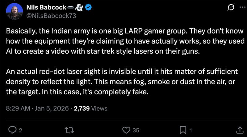 ایک اور صارف نے مزید سخت تنقید کرتے ہوئے کہا کہ یہ ویڈیو مصنوعی ذہانت کے ذریعے تیار کی گئی معلوم ہوتی ہے، جس میں بندوقوں پر اسٹار ٹریک جیسی لیزر دکھائی گئی ہیں۔ اس کے مطابق حقیقی سرخ نقطے والی لیزر سائٹس فضا میں اس طرح نظر نہیں آتیں جب تک دھواں، دھند یا کوئی ٹھوس ہدف موجود نہ ہو، اس لیے ویڈیو میں دکھائی گئی لیزر عملی حقیقت سے مطابقت نہیں رکھتی۔