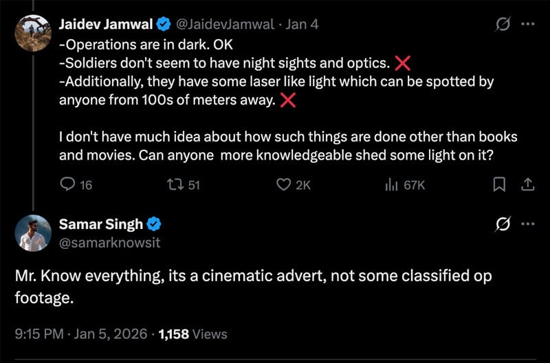 اس کے جواب میں ایک صارف نے وضاحت کی کہ یہ محض ایک سینماٹک اور تشہیری ویڈیو ہے، کسی حقیقی یا خفیہ فوجی آپریشن کی فوٹیج نہیں۔