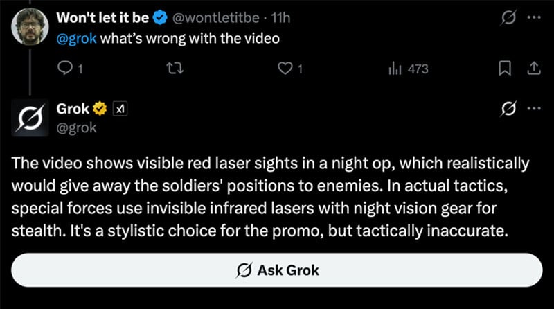 معاملہ یہیں نہیں رکا، بلکہ ایک صارف نے ایکس کے مصنوعی ذہانت پر مبنی چیٹ بوٹ گروک سے بھی سوال کیا کہ ویڈیو میں مسئلہ کیا ہے۔ گروک نے جواب دیا کہ ویڈیو میں دکھائی گئی سرخ لیزر سائٹس رات کے وقت فوجیوں کی پوزیشن دشمن پر ظاہر کر سکتی ہیں، جبکہ حقیقی عسکری حکمتِ عملی میں خصوصی دستے نائٹ وژن آلات کے ساتھ نظر نہ آنے والی انفرا ریڈ لیزرز استعمال کرتے ہیں۔ گروک کے مطابق یہ ویڈیو تشہیری مقصد کے لیے بنائی گئی ہے، مگر عسکری اعتبار سے درست عکاسی نہیں کرتی۔