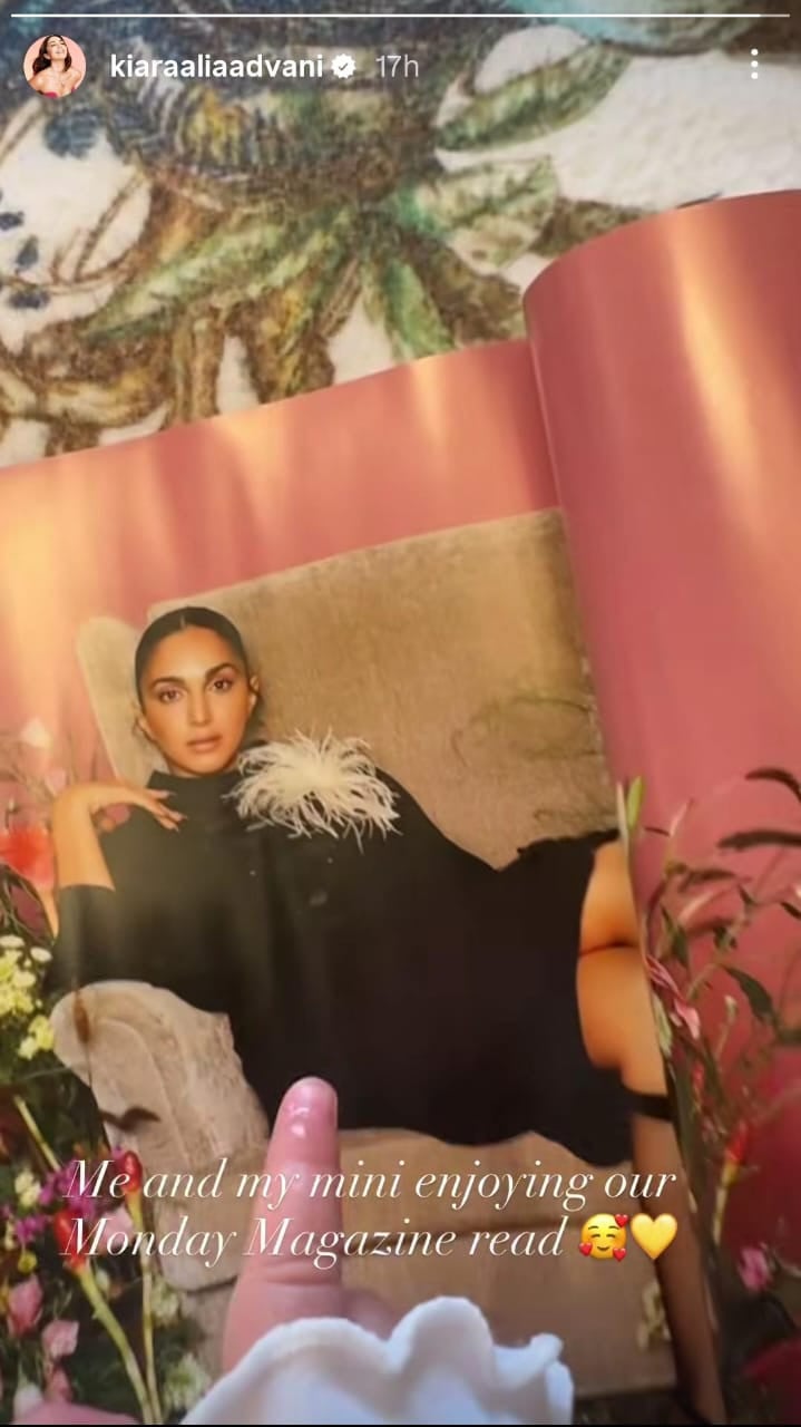 کیارا ایڈوانی نے اسٹوری کے ساتھ سادہ سا کیپشن لکھا کہ میں اور میری منی پیر کے دن میگزین پڑھنے سے لطف اندوز ہو رہے ہیں۔