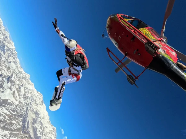 اولگا نومووا (جو گزشتہ 15 برس سے اسکائی سرفنگ کر رہی ہیں) نیپال کے ایک علاقے سیانگبوچے میں بلند ترین اسکائی سرف جمپ کا گینیز ورلڈ ریکارڈ بنانے کے لیے ہیلی کاپٹر سے کودیں۔
