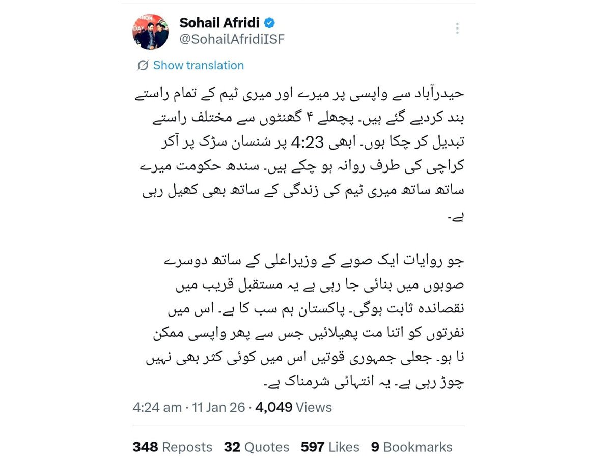 ایکسپریس نیوز کو موصول ہونے والی اطلاعات کے مطابق سہیل آفریدی گزشتہ رات حیدرآباد سے کراچی کے لیے روانہ ہوئے تھے، انہیں کراچی میں آج شام 4 بجے باغ جناح میں ایک جلسے سے خطاب کرنا تھا۔