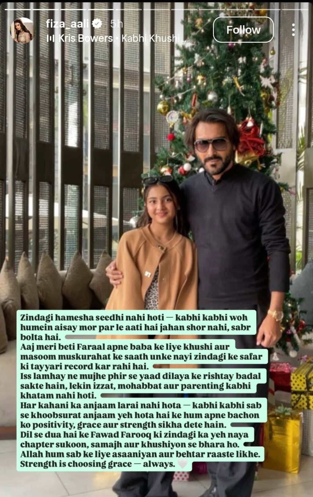 دوسری جانب، انسٹاگرام پر فضا علی نے ایک پوسٹ میں لکھا ہے کہ زندگی ہمیشہ سیدھی نہیں ہوتی، کبھی کبھی وہ ہمیں ایسے موڑ پر لے آتی ہے جہاں شور نہیں ہوتا، صرف صبر بولتا ہے۔