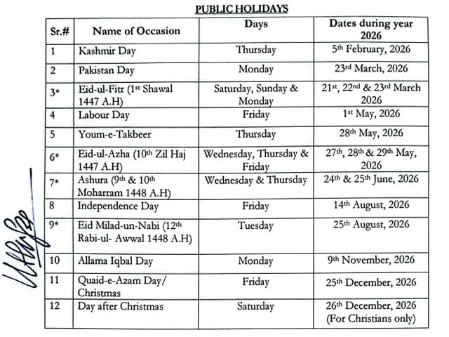 علامہ اقبال کی پیدائش پر 9 نومبر بروز پیر، قائداعظم کی سالگرہ اور کرسمس کے موقع پر 25 دسمبر کو عام تعطیل ہوگی جبکہ کرسمس کے اگلے روز 26 دسمبر کو صرف مسیحی برادری کے لیے چھٹی دی جائے گی۔