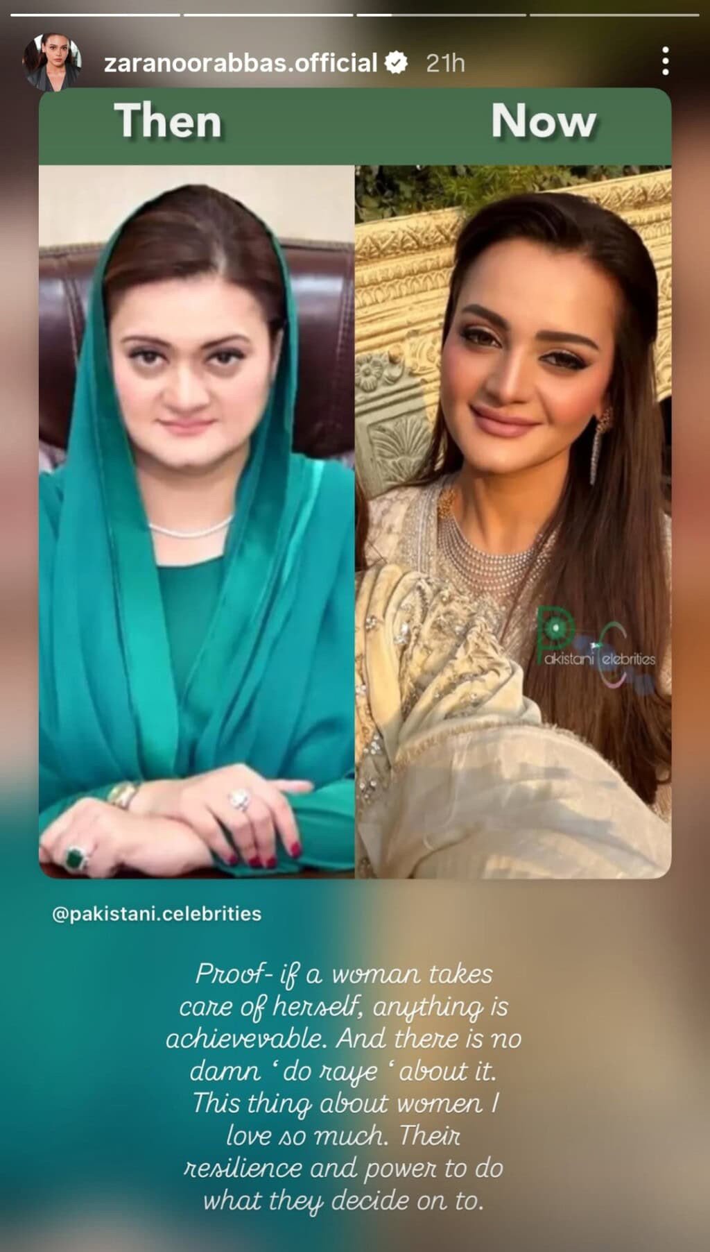 دوسری جانب زارا نور عباس نے بھی مریم اورنگزیب کی پہلی اور موجودہ تصاویر شیئر کرتے ہوئے لکھا کہ ’’اگر عورت اپنا خیال رکھنا شروع کردے تو کوئی بھی مقصد حاصل کیا جاسکتا ہے‘‘۔