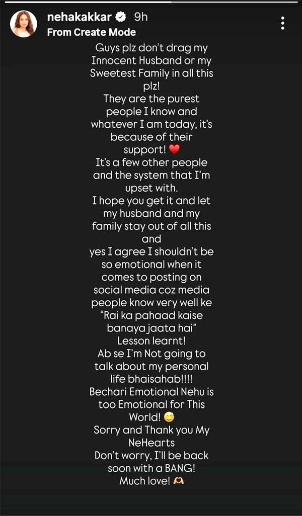 تاہم اب نیہا نے ایک نئی پوسٹ کے ذریعے ان خبروں کی تردید کرتے ہوئے واضح کیا ہے کہ ان کے شوہر روہن پریت سنگھ اور خاندان کو اس معاملے میں گھسیٹنا درست نہیں۔