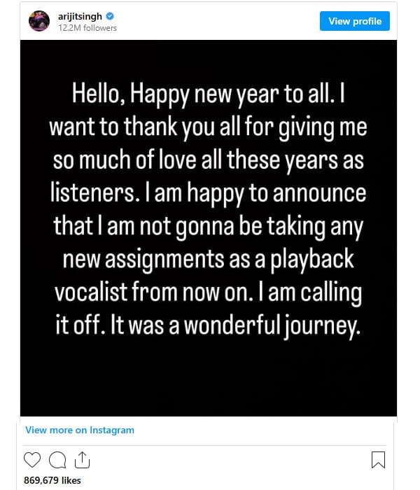 سماجی رابطے کی ویب سائٹ انسٹاگرام پر جاری اپنے بیان میں خوش گلو اریجیت سنگھ نے اپنے مداحوں کو نئے سال کی مبارک باد دی اور کہا کہ'میں آپ سب کا شکریہ ادا کرنا چاہتا ہوں کیونکہ آپ سب نے ان برسوں میں بطور مداح بہت زیادہ پیار دیا'۔