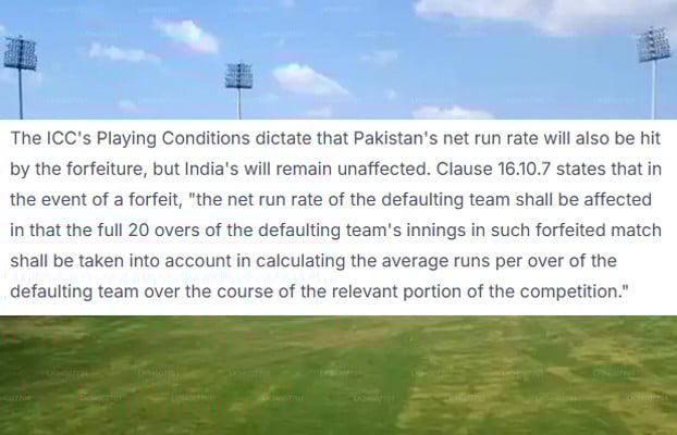 آئی سی سی کے قانون کی شق 16.10.7 کے تحت، اگر کوئی ٹیم میچ کھیلنے سے انکار کرے تو اس ٹیم کے نیٹ رن ریٹ کا حساب پھر بھی ایسے کیا جائے گا کہ گویا اس ٹیم نے اس میچ میں پورے 20 اوورز کھیلے ہوں۔
