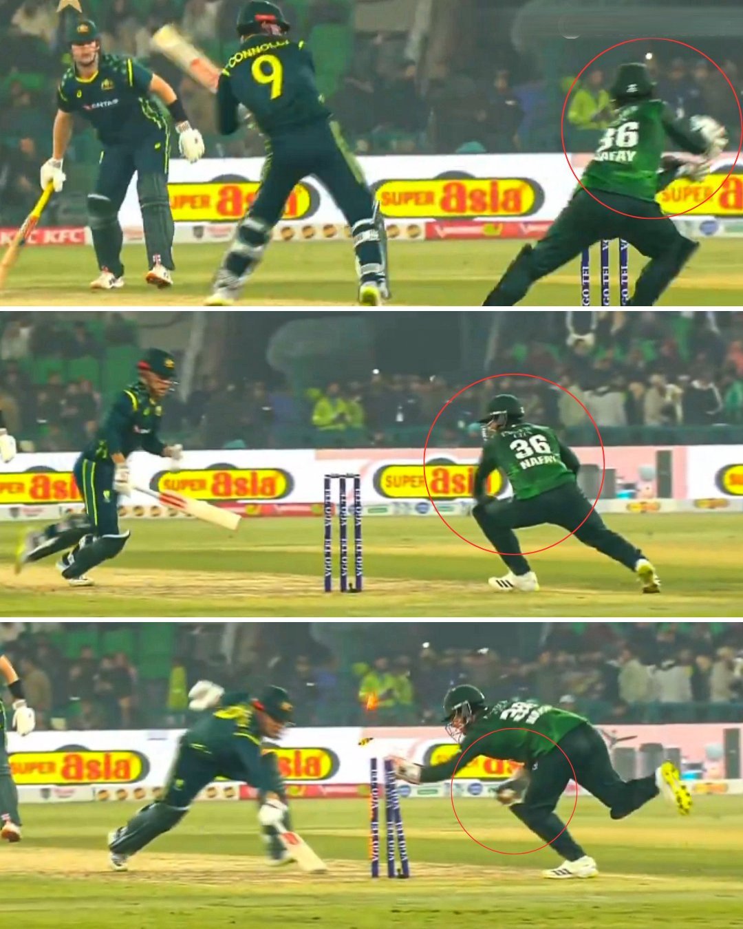 ایسے میں کوپر کونولی نے میچ کے سب سے کامیاب بولر محمد نواز کی گیند پر آگے نکل کھیلنے کی کوشش کی تاہم گیند ان کی لیگ سائیڈ سے کیپر کے ہاتھوں میں چلی گئی جنہوں نے پھرتی کا مظاہرہ کرتے ہوئے ایک مشکل اسٹمپ کیا۔