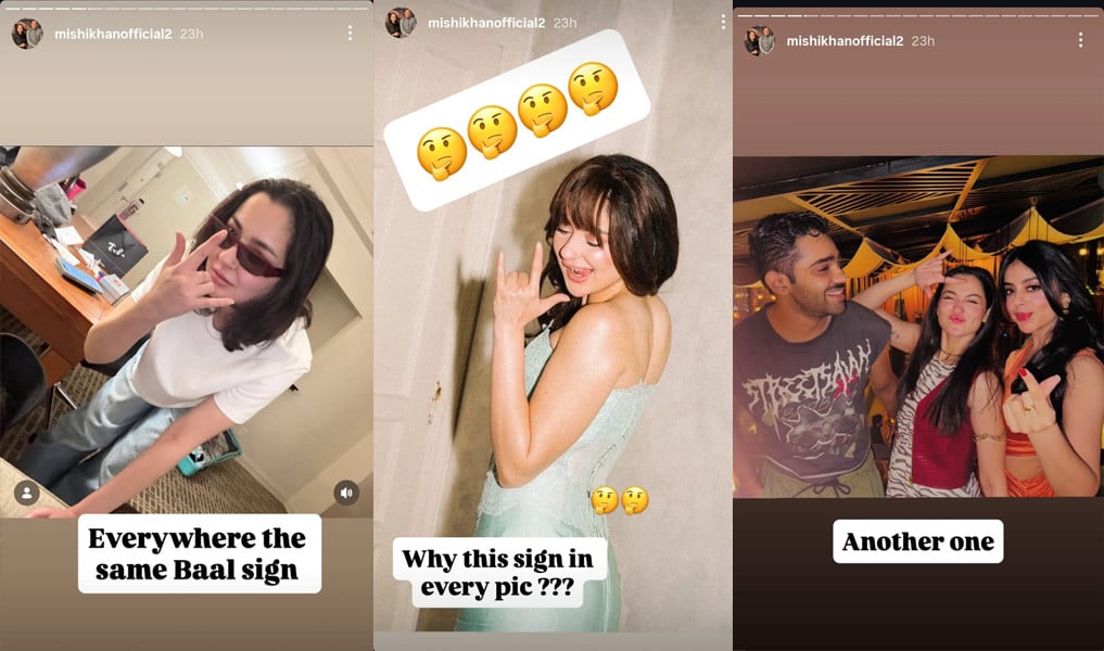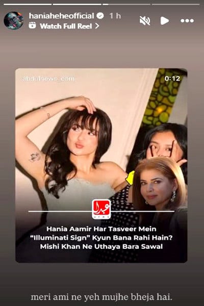 مشی خان نے انسٹاگرام پر چند تصاویر شیئر کیں جن میں ہانیہ عامر ایک مخصوص ہاتھ کے اشارے کے ساتھ نظر آ رہی ہیں۔ مشی خان کا کہنا ہے کہ یہ علامت مبینہ طور پر ’ایلومیناٹی‘ سے جڑی ہوئی سمجھی جاتی ہے اور ہانیہ عامر نے یہ انداز ایک سے زیادہ مرتبہ اختیار کیا ہے، جس پر وہ سوال اٹھا رہی ہیں۔