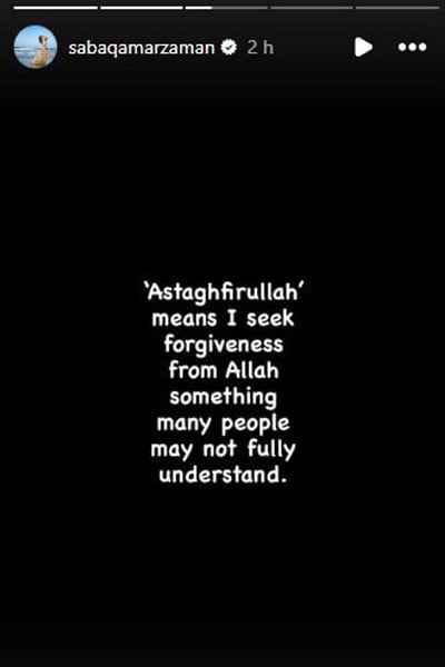 اسی دوران اداکارہ صبا قمر نے انسٹاگرام پر ایک اسٹوری شیئر کی جس میں وضاحت کی گئی کہ استغفراللہ ایک جملہ ہے جو اللہ سے معافی مانگنے کے لیے استعمال ہوتا ہے۔ لوگوں نے میری بات کو غلط سمجھا۔