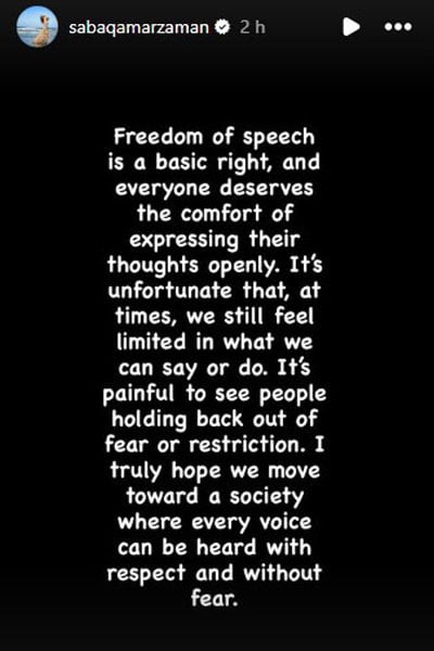 صبا قمر نے ایک پوسٹ میں زور دیا کہ ہر کسی کو اپنی رائے دینے کا حق حاصل ہے۔ آزادی اظہار رائے اہم ہے اور کسی کو خوف یا پابندی کی وجہ سے اپنے خیالات چھپانے پر مجبور نہیں ہونا چاہیے۔