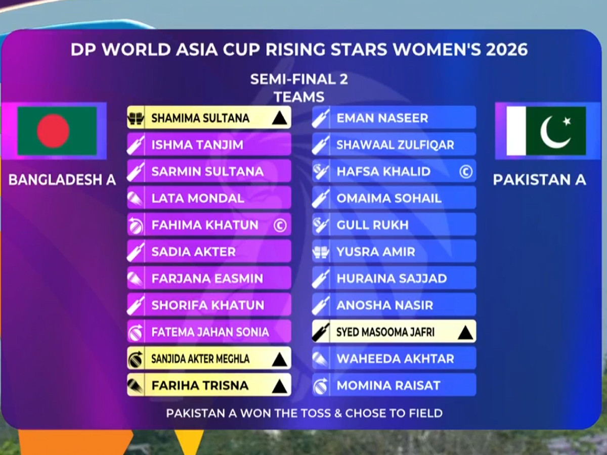 ویمنز ایشیاکپ رائزنگ اسٹارز کے سیمی فائنل میں پاکستان نے بنگلادیش کے خلاف ٹاس جیت کر پہلے بولنگ کرنے کا فیصلہ کیا ہے۔
