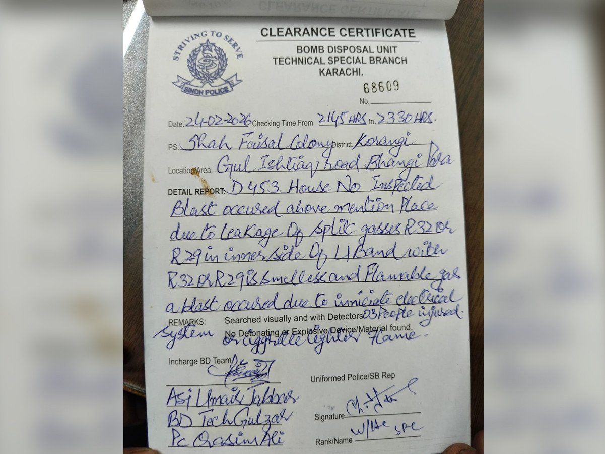 شہر قائد کےعلاقے شاہ فیصل کالونی میں ہونے والے دھماکے کے حوالے سے بم ڈسپوزل اسکواڈ نے اپنی رپورٹ جاری کر دی ہے جس میں انکشاف کیا گیا ہے کہ دھماکا حادثاتی تھا اور اس میں کوئی بارودی مواد یا بم شامل نہیں تھا۔