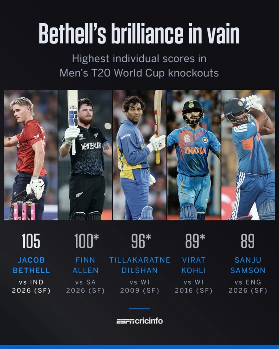 اس میچ میں انگلینڈ کے جیکب بیتھل نے 105 رنز کی شاندار اننگز کھیلی، جو ٹی ٹوئنٹی ورلڈکپ کے ناک آؤٹ میچ میں سب سے بڑا انفرادی اسکور ہے۔